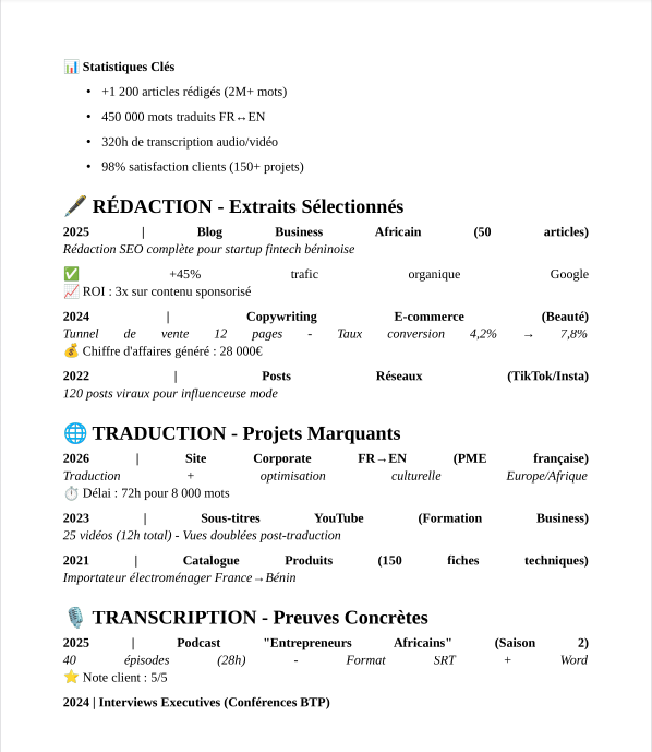 Bonjour ! Je suis un rédacteur, traducteur et transcripteur freelance basé à Cotonou (Bénin), passionné par les mots et la communication efficace. Bilingue français-anglais avec une excellente maîtrise orthographique, je transforme vos idées en contenus percutants qui convertissent.