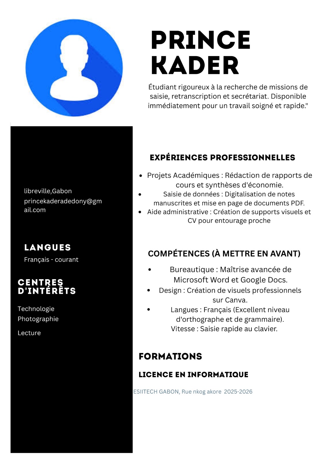 Étudiant sérieux et dynamique, je mets ma rigueur et ma maîtrise des outils bureautique (Word, Google Docs, Canva) à votre service. Je me spécialise dans la saisie de documents, la retranscription et la mise en page de CV. Mon objectif : vous fournir un travail impeccable, sans fautes et livré dans les délais.