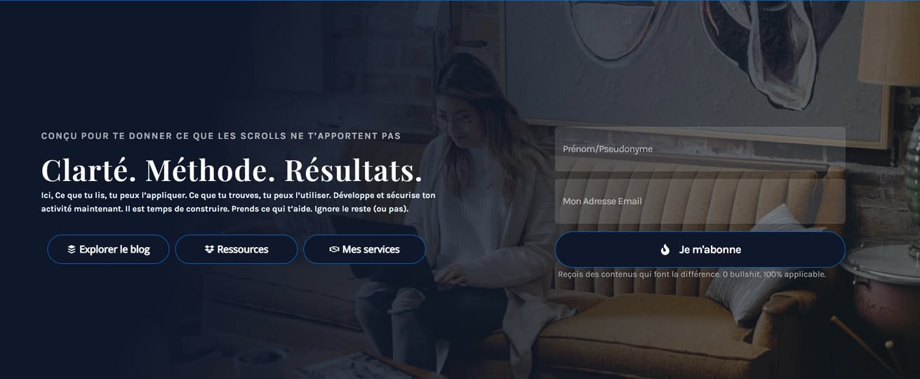 J’ai construit un écosystème digital solide autour de mes compétences, avec un blog, des offres packagées, des produits juridiques pour freelances et une présence active sur les réseaux.