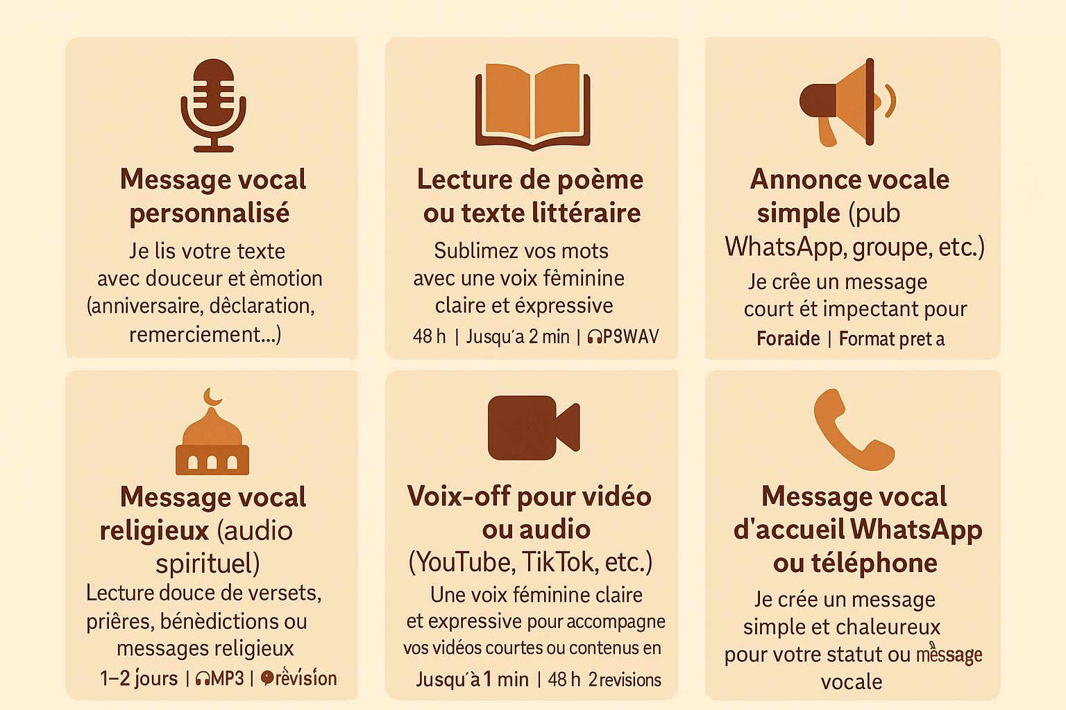 *Une voix féminine douce et pleine d’émotion pour sublimer vos messages, poèmes et annonces. Je vous offre une prestation rapide et de qualité, avec le sourire !*